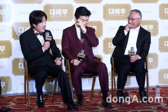 배우 오달수(왼쪽부터), 윤제문, 오달수가 17일 오후 서울 광진구 건대입구 롯데시네마에서 열린 영화 ‘대배우’ 제작발표회에 참석해 기자간담회를 하고 있다.