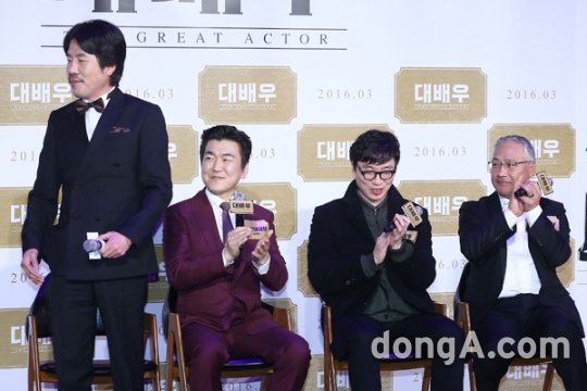 배우 오달수(왼쪽부터), 윤제문, 석민우 감독, 이경영이 17일 오후 서울 광진구 건대입구 롯데시네마에서 열린 영화 ‘대배우’ 제작발표회에 참석해 기자간담회를 하고 있다.