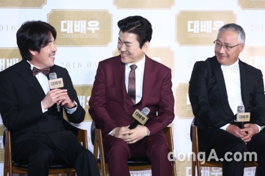 배우 오달수(왼쪽부터), 윤제문, 이경영이 17일 오후 서울 광진구 건대입구 롯데시네마에서 열린 영화 ‘대배우’ 제작발표회에 참석해 기자간담회를 하고 있다.