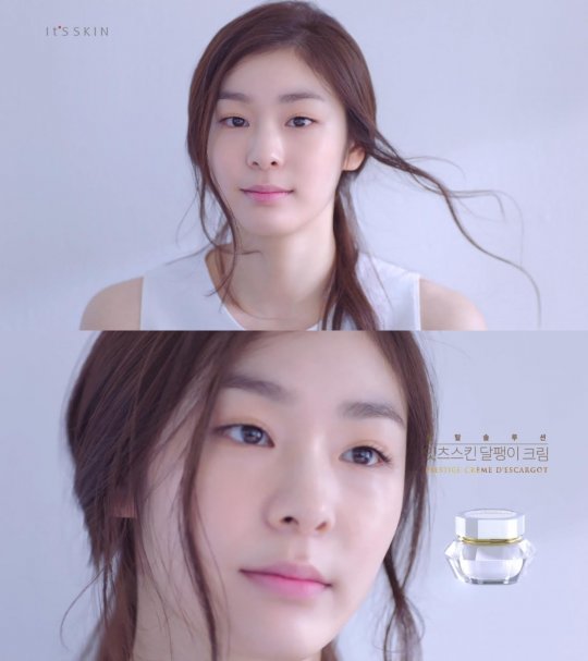 잇츠스킨 ‘프레스티지 끄렘 데스까르고’ CF에서 김연아는 ‘5가지 멀티이펙트로 연아의 피부고민, 제로’라는 콘셉트 아래, 우아하고 아름다운 매력을 선보인다. 특히 빙판에서 보여주던 강렬한 메이크업과는 다른 민낯에 가까운 청초하고 순수한 모습으로 ‘결점제로’의 피부를 뽐낸다.