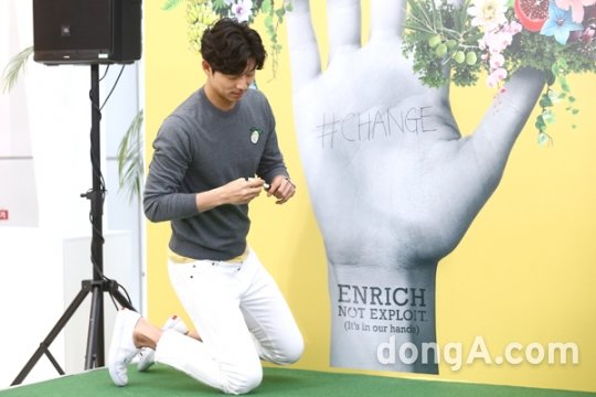 배우 공유가 18일 오전 서울 영등포구 영등포 타임스퀘어에서 열린 더바디샵 '모두를 풍요롭게 하는 세상, 희생 없이 우리가 만들어 갈 수 있습니다(ENRICH NOT EXPLOITTM it's in our hands)'라는 새로운 기업이념 메시지를 알리는 체인지(CHANGE) 캠페인 행사에 참석해 포즈를 취하고 있다.