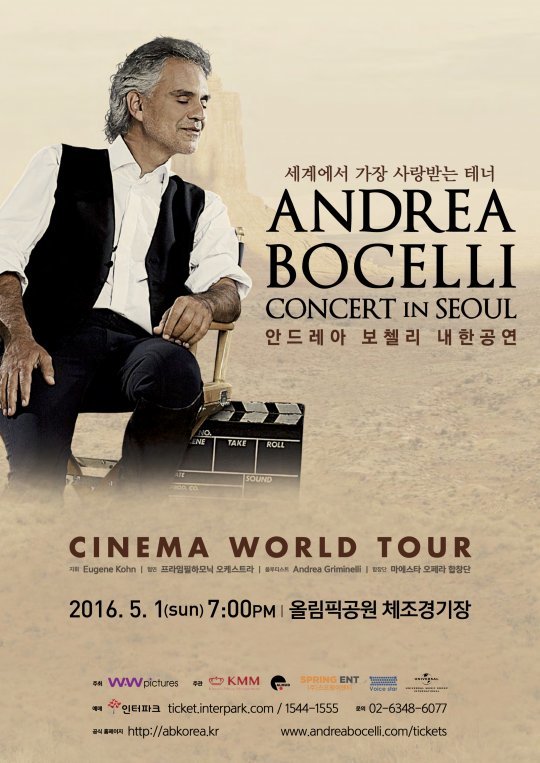 클래식과 팝을 넘나드는 세계 최고의 테너 안드레아 보첼리가 2016년 5월 1일 오후 7시, 올림픽공원 체조경기장에서 내한공연을 갖는다.