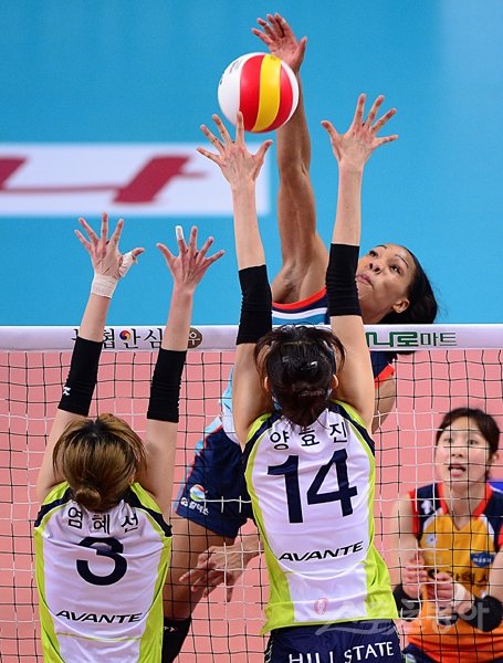 GS칼텍스 외국인선수 캣벨이 18일 장충체육관에서 벌어진 현대건설과의 홈경기 도중 블로킹 벽을 뚫고 스파이크를 시도하고 있다. 장충|김진환 기자 kwangshin00@donga.com