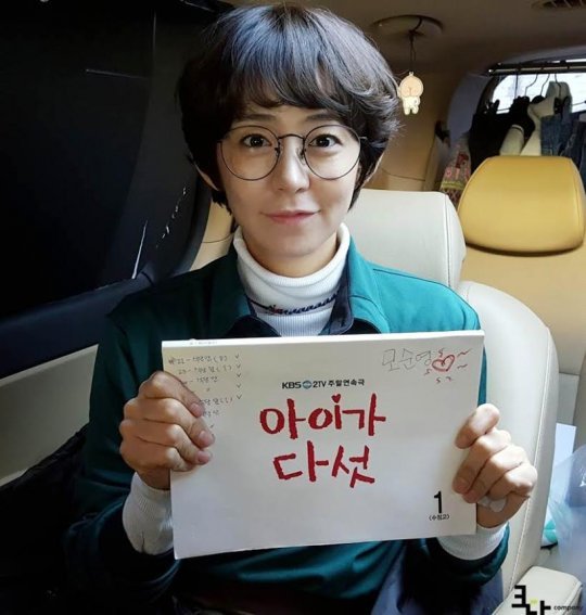19일 공개된 사진 속 짧은 커트 머리에 커다란 잠자리 안경을 쓰고 있는 심이영은 ‘아이가 다섯’ 1회 대본을 들고 있다.