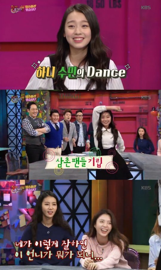 MC들은 이수민의 댄스를 궁금해 했고 이수민은 대세 걸그룹 여자친구의 ‘시간의 달려서’를 완벽 소화해 삼촌팬들의 기립박수를 받았다.