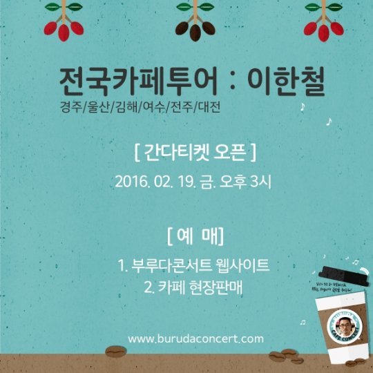 이번 전국카페투어는 국내 최초 콘서트 소셜플랫폼 ‘부루다콘서트’가 기획 및 제작한 공연으로 싱어송라이터 이한철을 비롯해 좋아서하는밴드도 카페투어에 함께할 예정이다.