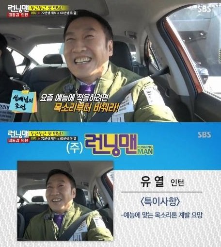 '런닝맨'에서 방송인 유재석(44)이 가수 유열(55)의 목소리 톤을 지적했다.