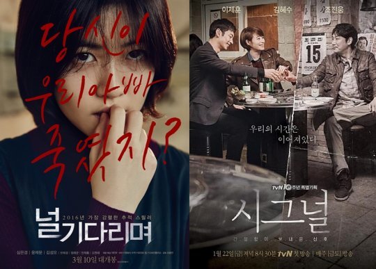 2016년 상반기 스크린과 브라운관에 ‘스릴러’ 장르 작품들이 화제의 선상에 올랐다. 바로 아빠를 죽인 범인을 15년간 기다린 소녀 ‘희주’의 이야기로부터 시작되는 스릴러 영화 ‘널 기다리며’와 과거로부터 걸려온 간절한 신호(무전)를 통해 미제 사건을 해결해나가는 현재와 과거 형사들의 이야기를 담은 드라마 ‘시그널’이 그 주인공. 이 두 작품의 공통점은 믿고 보는 명배우들의 열연과 함께 숨막히는 추적스릴러 장르라는 것이다.