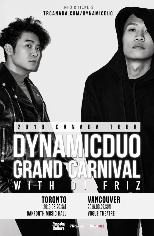 한편 다이나믹듀오는 오는 3월 미국과 캐나다 7개 주요 도시에서 개최되는 북미 투어 ‘DYNAMIC DUO GRAND CARNIVAL TOUR’ (다이나믹듀오 그랜드 카니발 투어)를 진행하고, 캐나다 투어인 ‘그랜드 카니발 투어 – 2016 캐나다 투어’ 티켓은 2월 25일 (현지 시간) 오픈 된다.