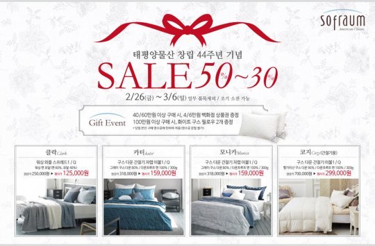 태평양물산의 프리미엄 베딩 전문 브랜드 ‘소프라움’이 “태평양물산 창립 44주년 기념세일”을 진행한다. 이번 행사에서는 최대 50% 할인 이벤트 및 사은품이 증정되며 오는 26일(금)부터 3월 6일(일)까지 10일간 소프라움 전 매장에서 실시한다.