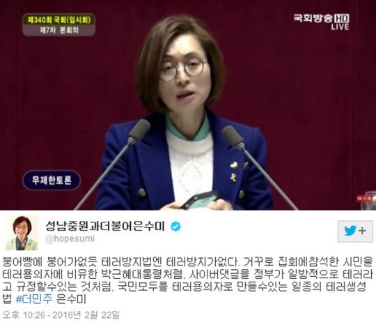 지난 22일 은수미 의원은 필리버스터 발언에 앞서 자신의 트위터에 “붕어빵에 붕어가 없듯 테러방지법엔 테러 방지가 없다. 거꾸로 집회에 참석한 시민을 테러용의자에 비유한 박근혜대통령처럼, 사이버댓글을 정부가 일방적으로 테러라고 규정할수있는 것처럼, 국민모두를 테러용의자로 만들 수 있는 일종의 테러 생성법”이라며 테러방지법 반대 의사를 밝혔다.