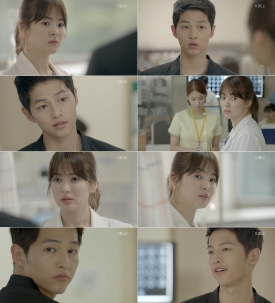 송중기는 차갑게 뒤돌아서는 송혜교에게 순간 마음이 흔들리는 듯한 모습으로 눈길을 끌었다.