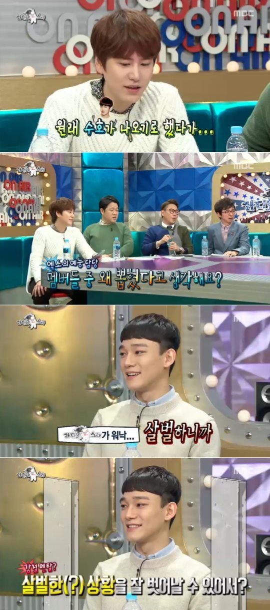 24일 밤 방송된 MBC ‘황금어장-라디오스타’에서는 첸이 출연하게 된 과정이 언급됐다. 알고 보니 첸은 다른 멤버들을 제치고 당당하게 ‘라디오스타’ 출연 멤버로 선정된 것.