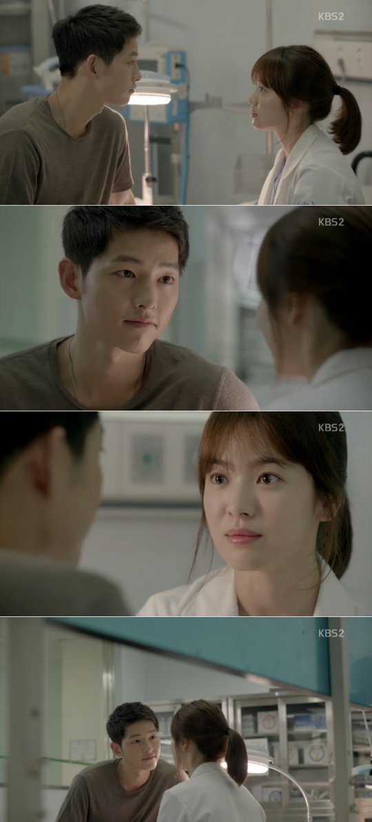 24일 첫방송된 KBS2 ‘태양의 후예’(극본 김은숙, 김원석, 연출 이응복, 백상훈 제작 태양의후예 문화산업전문회사, NEW)에서는 특전사 시진(송중기)과 여의사 모연(송혜교)의 첫 만남이 그려졌다.