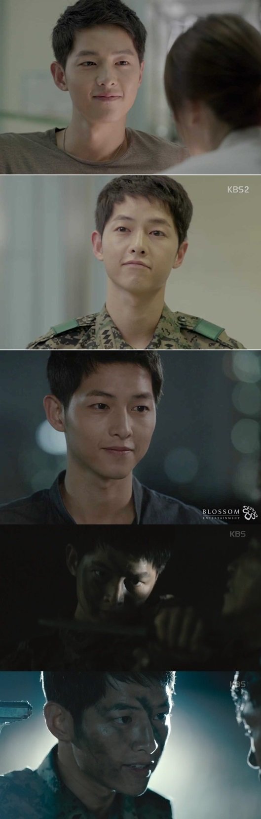 1회는 송중기로 시작됐다. 유시진은 팀원들을 이끌고 작전을 수행하며 북한군과 대립하는 일촉즉발의 상황에서도 여유로움과 강한 카리스마를 보여줬다. 절도 있는 단검 액션은 초반 시청자들의 보는 재미를 더하기에 충분했다. 이후 불량배들과의 싸움에서도 여러 명을 한 번에 제압하며 남성적인 매력을 나타냈다.