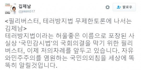 25일 김제남 의원은 자신의 SNS에 “테러방지법이라는 허울좋은 이름으로 포장된 사실상 ‘국민감시법’의 국회의결을 막기 위한 필리버스터, 이제 저의 차례를 앞두고 있습니다”라며 “자유와 민주주의를 염원하는 국민의 외침을 세상에 똑똑히 알릴 것입니다”라고 밝혔다.