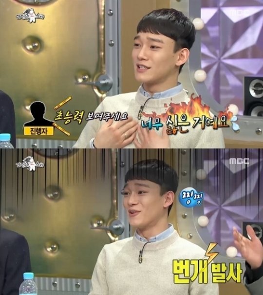 MC들이 “초능력을 보여달라”고 짓궃은 요구를 하자 첸은 “‘번개 발사’라고 외치며 손가락으로 찌르면 CG로 빛이 나갔다”고 설명하며 ‘번개 파워’를 발사해 웃음을 자아냈다.