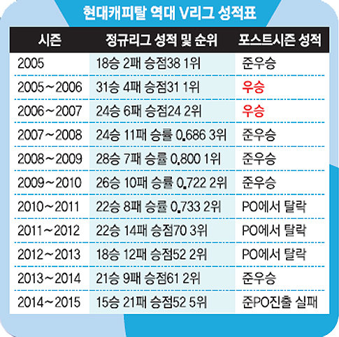 최태웅 감독이 이끄는 현대캐피탈이 2015∼2016 NH농협 V리그에서 거침없는 질주 끝에 마침내 정규리그 우승을 차지했다. 현대캐피탈로선 7년 전인 2008∼2009시즌 이후 처음인 경사다. 의미를 높이기 위해 한 시즌 팀 최다연승 신기록인 16연승으로 우승을 더욱 뜻 깊게 했다. 김호철 감독이 지휘했던 7년전 당시의 현대캐피탈은 팀 명칭 스카이워커스처럼 공중전에 특화된 팀이었다. 이선규 윤봉우 박철우 후인정 앤더슨 권영민 임시형 오정록이 멤버였다.