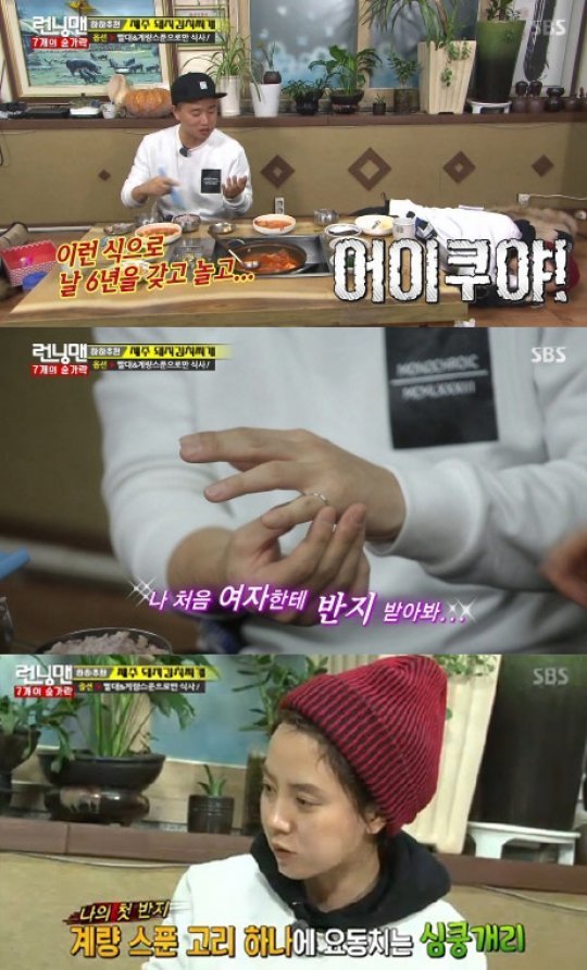 이때 송지효가 계량용 스푼 고리를 개리의 새끼손까락에 끼워줬다. 이에 개리는 “약혼반지냐. 이런 식으로 날 6년 갖고 놀고, 진백림한테 가냐”고 화를 내 또 한 번 웃음을 안겼다. 하지만 이내 “여자한테 처음으로 반지 받아본다”며 함박 웃음을 지었다.