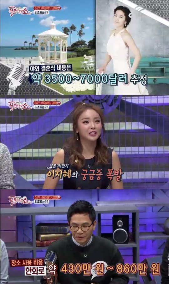 생각보다 비싸지 않은 비용에 결혼 적령기에 접어든 이지혜는 “식대도 포함한 가격인 것이냐”고 물으며 관심을 보였다.