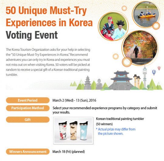 한국관광공사는 외국인 관광객의 재방문 확대를 위해 대표 체험관광 50선 선정 사업을 진행한다. 2일부터 13일까지 한국관광 외국어 정보 사이트에서 외국인을 대상으로 온라인 선호도 투표를 실시한다.