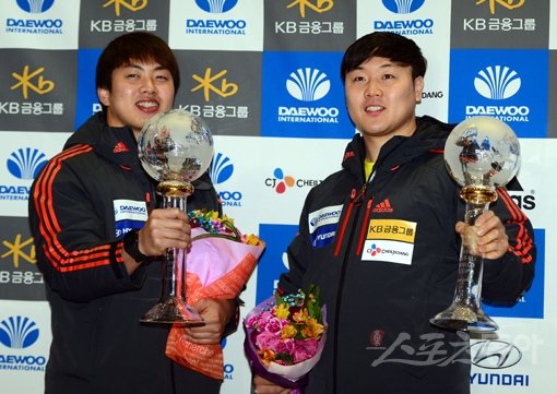 세계를 제패한 봅슬레이 2인승의 서영우-원윤종(왼쪽부터)이 1일 인천국제공항을 통해 귀국한 뒤 트로피를 들고 미소 짓고 있다. 이들이 꾸준한 성적을 내기 위해선 꾸준한 관심과 지원이 필요하다. 스포츠동아DB