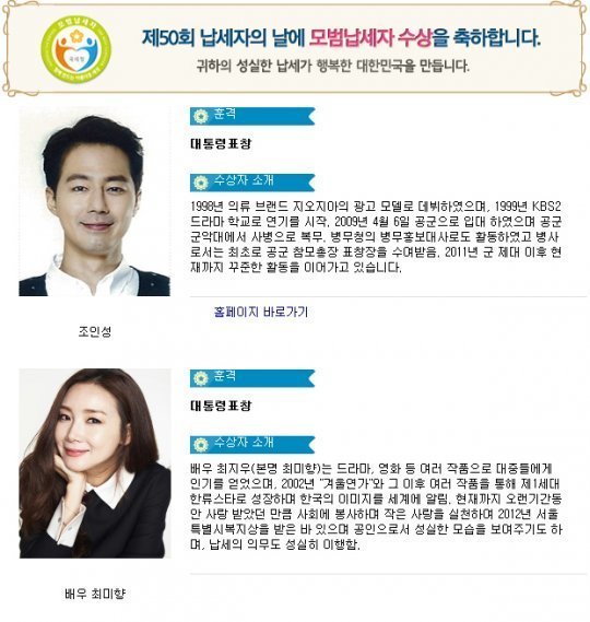 조인성과 최지우가 모범납세자로 대통령 표창을 받았다.