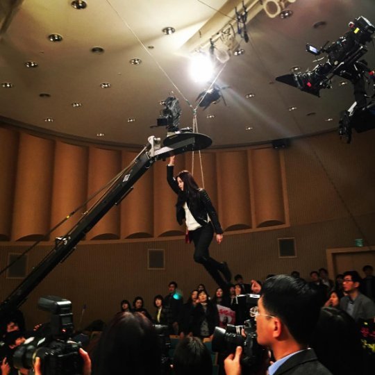 공개된 사진에는 와이어에 매달려 공중에 떠있는 오연서의 모습이 담겼다.