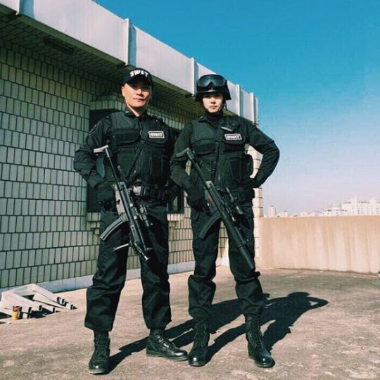 공개된 사진 속 조윤희는 검은색 특공대복과 헬멧, 군화를 착용한 채 총을 들고 배우 조재윤과 어깨를 나란히 하고 있다.