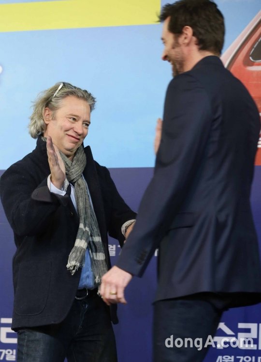 할리우드 감독 덱스터플레처(왼쪽)과 배우 휴잭맨이 7일 오전 서울 광화문 포시즌즈호텔에서 열린 영화 '독수리 에디'의 제작발표회에 참석하고 있다.