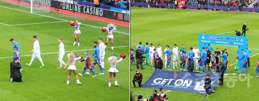 크리스털 팰리스 선수들이 6일(한국시간) 셀허스트파크에서 벌어진 리버풀과의 홈경기에 앞서 팀 소속 치어리더들의 환영을 받으며 입장한 뒤(왼쪽 사진), 상대 선수들과 인사를 나누고 있다. 런던|남장현 기자 yoshike3@donga.com