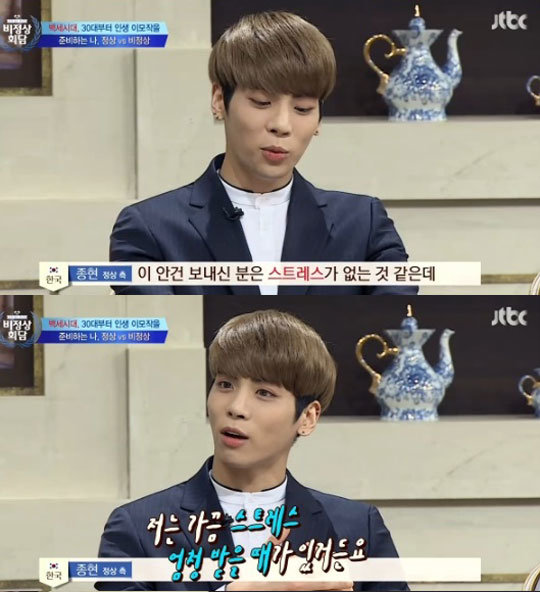 이날 ‘30대부터 인생 이모작을 준비하는 나, 비정상이냐’는 ‘비정상회담’안건에 종현은 “저도 미래를 준비하다가 당장을 못 즐기는 편”이라며 “가끔 스트레스를 엄청 받을 때가 있다. 난 행복한가란 생각을 해봤는데, 그렇지 않은 것 같다”고 털어놨다.
