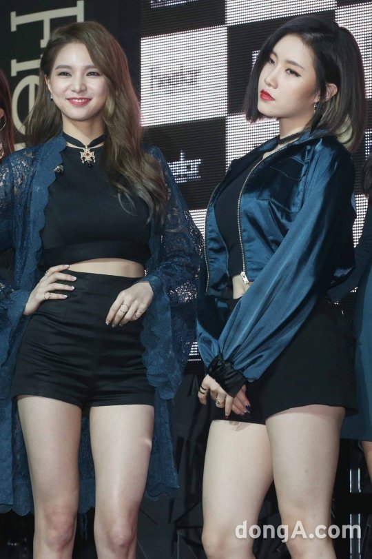 피에스타의 재이(왼쪽)와 예지가 9일 오전 서울 마포구 YES24 무브홀에서 열린 두번째 미니앨범 ‘어 델리케이트 센스(A Delicate Sense)’ 발매 기념 쇼케이스에서 포토타임을 하고 있다.