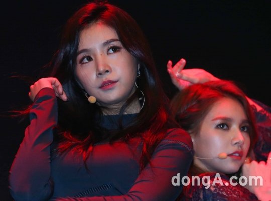 피에스타의 차오루가 9일 오전 서울 마포구 YES24 무브홀에서 열린 두번째 미니앨범 ‘어 델리케이트 센스(A Delicate Sense)’ 발매 기념 쇼케이스에서 화려한 무대를 선보이고 있다.