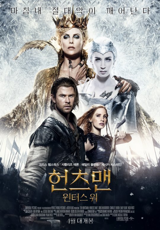 또한 2014년 개봉해 460만여명의 관객을 동원한 ‘엣지 오브 투모로우’에서 전쟁영웅 ‘리타 브라타스키’ 역을 통해 강렬한 카리스마를 보여주었던 에밀리 블런트는 세상에 대한 분노로 차가운 악을 지니게 된 ’아이스 퀸’으로 분해, ‘이블 퀸’에 대항하며 세기의 강력한 대결을 펼칠 것이다. 여기에 헌츠맨 ‘에릭(크리스 헴스워스)’과 ‘사라(제시카 차스테인)’가 절대악에 맞서 싸우는 운명적 대결까지 더해져 압도적인 스케일을 선사할 예정.