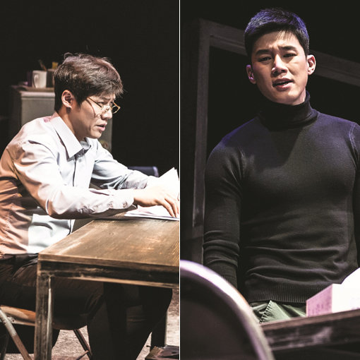 연극 얼음에서 형사1을 맡은 박호산과 형사2 김무열(왼쪽부터)이 빈 의자를 상대로 취조를 하고 있다. 박호산은 “실제로 살인 용의자가 앞에 앉아 있다고 여기고 독백하듯 하는 연기가 굉장히 힘들다”고 털어놓았다. 사진제공|수현재컴퍼니