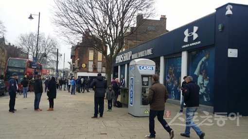 토트넘 골수팬 제이미 혹슨(사진 가운데 뒷모습 남성)과 아들 지미가 지난 주말 런던 홈구장 화이트하트레인에서 열린 아스널과 북런던더비를 관전하기 앞서 클럽 메가스토아 출입을 기다리고 있다. 런던|남장현 기자 yoshike3@donga.com