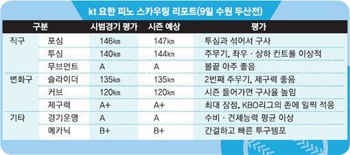 두산은 김재호의 대주자로 나선 류지혁이 바로 2루를 훔쳤다. kt의 약점을 파고든 것인데, 피노는 흔들리지 않고 후속타자를 막았다. 5회 1사 후 오재일에게 2루타를 맞은 뒤에도 결정타를 피해갔다. 정 코치는 “나이가 있으니 체력이 변수”라고 말했지만, 그만큼 경험이 풍부하다는 것은 장점이다. kt에선 “구위만 따지면 피노가 외국인투수 3명 중 3번째”라고 평가한다. 그러나 제구력과 경기운영능력을 종합하면 피노의 경쟁력이 증폭된다. 피노는 “KBO리그의 스트라이크존을 파악하고 싶었는데, 내 생각과 거의 일치했다”고 한국무대 첫 등판 소감을 밝혔다.