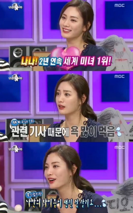 9일 오후 방송된 MBC ‘황금어장-라디오스타’에서 MC 김구라는 나나에게 “세계 미녀 1위를 하고 불편한 점이 있냐”고 물었다.