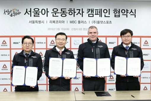 이와 관련해 MBC플러스는 15일(화) 서울시 신청사 영상회의실에서 류경기 서울시 행정1부시장, 쟝 미쉘 그라니에 리복 코리아 대표이사, (주)올댓스포츠 구동회 대표이사와 함께 성공적인 캠페인 추진을 위한 협약식을 가졌다.