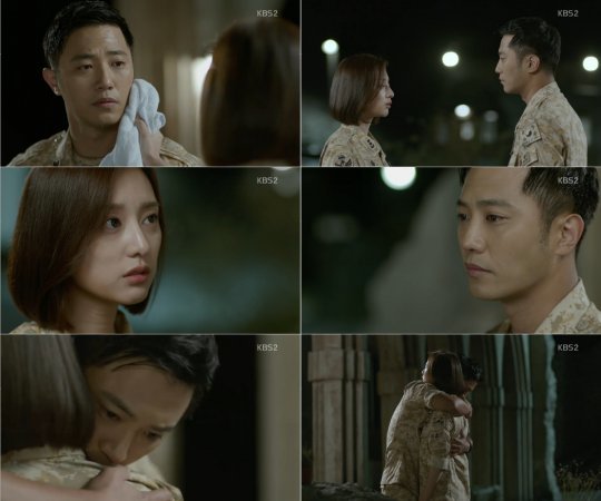 16일 밤 방송된 KBS2 ‘태양의 후예’(극본 김은숙, 김원석/연출 이응복, 백상훈/제작 태양의후예 문화산업전문회사, NEW) 7회에서는 명주(김지원)와 대영(진구)이 구조를 마치고 대화하는 모습이 그려졌다.
