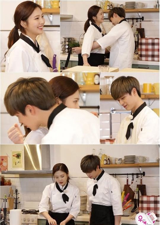사진 속 두 사람은 서로의 앞치마 매무새를 다듬어주며 묘한 스킨십을 하고 있다. 특히 앞치마 끈을 묶어주는 과정에서 은근슬쩍 스킨십이 반복되고, 이로 인해 사랑스러운 기운이 드러나며 시선을 모을 예정이다.