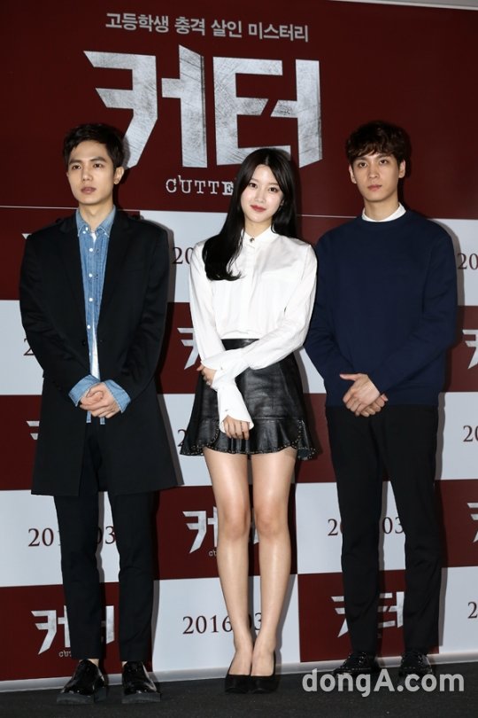 배우 김시후(왼쪽부터), 문가영, 최태준이 18일 오후 서울 성동구 왕십리CGV에서 열린 영화 ‘커터’ 언론시사회에 참석해 포토타임을 하고 있다.
