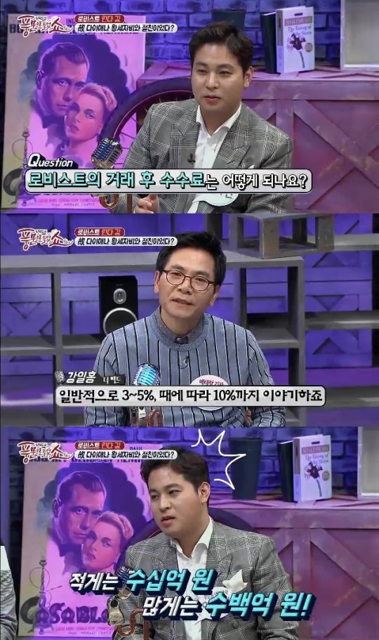 이에 패널들은 로비스트의 수입을 궁금해 했고 로비스트의 거래 후 수수료를 묻는 패널들의 질문에 한 기자는 “일반적으로 3~5%, 때에 따라 10%”라며 “적게는 수십억 원, 많게는 수백억 원까지 받는다”고 공개해 놀라움을 자아냈다.