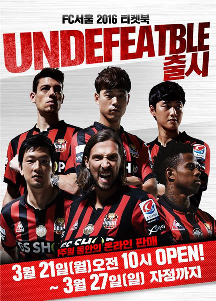 FC서울이 21일부터 홈경기를 저렴하게 즐길 수 있는 FC서울 ‘UNDEFEATABLE 2016 티켓북’ 판매에 들어갔다. 27일까지 온라인으로 판매되는 티켓북은 친구, 연인, 가족 모두 함께 쓸 수 있는 패키지 상품으로 일반 티켓보다 최대 29% 할인된 가격에 구입할 수 있다. 일반석(5매) 5만원, 동측 지정석(5매) 5만5000원, 서측지정석(5매) 8만원, VIP 테이블석(6매) 15만원에 판매되며, GS25 월드컵경기장점에서 사용할 수 있는 3000원 상당의 스낵 교환권이 주어진다.