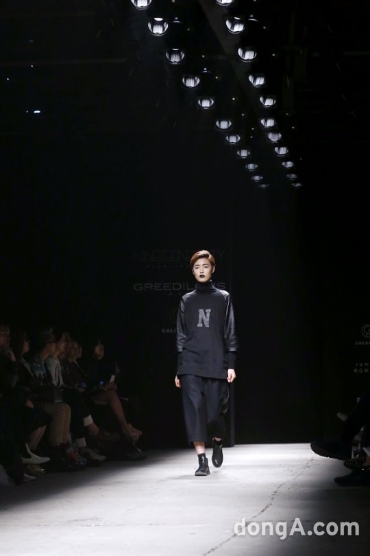 모델이 22일 오후 서울 영등포구 DAESUNFM FACTORY에서 열린 2016 F/W 서울패션위크 박윤희 디자이너 ‘GREEDILOUS’ 컬렉션 런웨이를 걷고 있다.