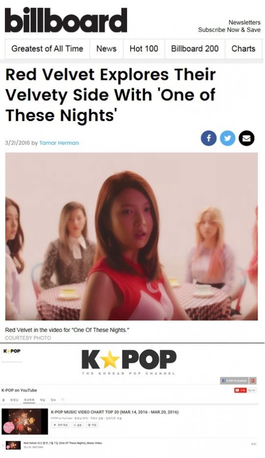 더불어 레드벨벳의 타이틀 곡 ‘7월 7일(One of These Nights)’ 뮤직비디오는 유튜브 K-POP 채널의 ‘K-POP 뮤직비디오 차트 TOP 20’(3월 14일~20일)에서 1위에 등극해 레드벨벳에 대한 전 세계 팬들의 높은 관심을 확인시켜 주었다.