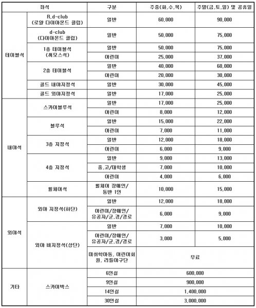 공휴일 및 주말 입장료는 성인 기준으로 R.d-club 9만원, d-club 7만5천원, 1층 테이블석(써모스석) 7만5천원, 2층 테이블석 6만원, 골드 내야지정석 4만5천원, 골드 외야지정석 2만5천원, 스카이블루석 2만5천원, 블루석 2만2천원, 3층 지정석 1만8천원, 4층 지정석 1만3천원, 외야 지정석 1만8천원, 외야 비지정석 1만원이다.