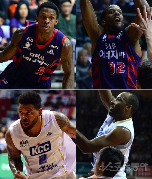KCC와 오리온의 ‘2015~2016 KCC 프로농구’ 챔피언 결정전에선 용병 2명이 동시에 뛰는 2·3쿼터가 승부의 분수령이 되고 있다. 오리온 조 잭슨과 애런 헤인즈는 2·3차전 맹활약으로 팀의 2승을 합작한 반면 KCC 허버트 힐과 안드레 에밋(위 왼쪽부터 시계방향으로)은 상대 수비에 고전하고 있다. 스포츠동아DB
