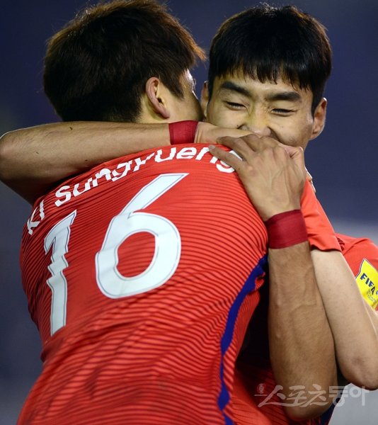 24일 경기도 안산 와 스타디움에서 '2018 러시아월드컵 아시아 2차 예선' 대한민국과 레바논의 경기가 열렸다. 후반 인저리 타임에 골을 넣은 이정협이 어시스트를 한 기성용과 기쁨을 나누고 있다.